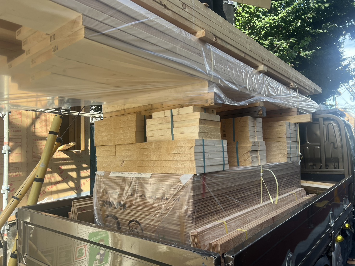 運び終えた木材は、大工さんの指示に従って、種類ごとに決められた場所に揃えて置きます。トラックに積まれていた木材すべてを所定の場所に置いたら作業終了です!